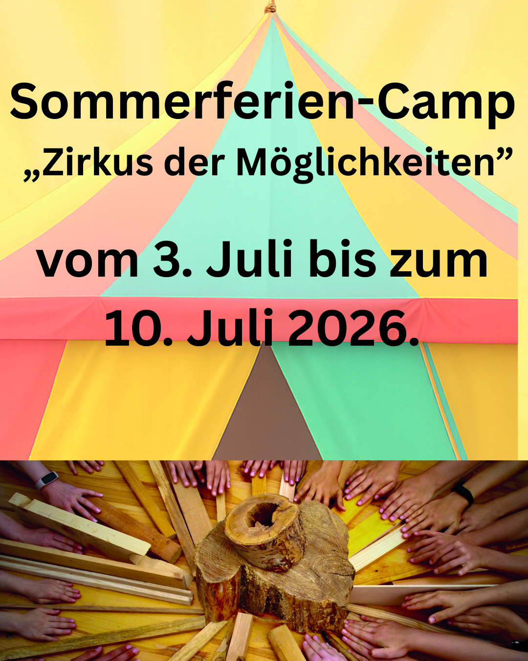 Erlebe das Abenteuer deines Lebens! Vom 3. bis 10. Juli 2026 findet in Neuschönburg, direkt gegenüber vom Badeteich, unser spannendens Feriencamp unter dem Motto "Zirkus der Möglichkeiten" statt. Hier haben Kinder und Jugendliche im Alter von 7 bis 17 Jahren die Möglichkeit, ihre Talente in vielfältigen Workshops zu entdecken und auszuleben.