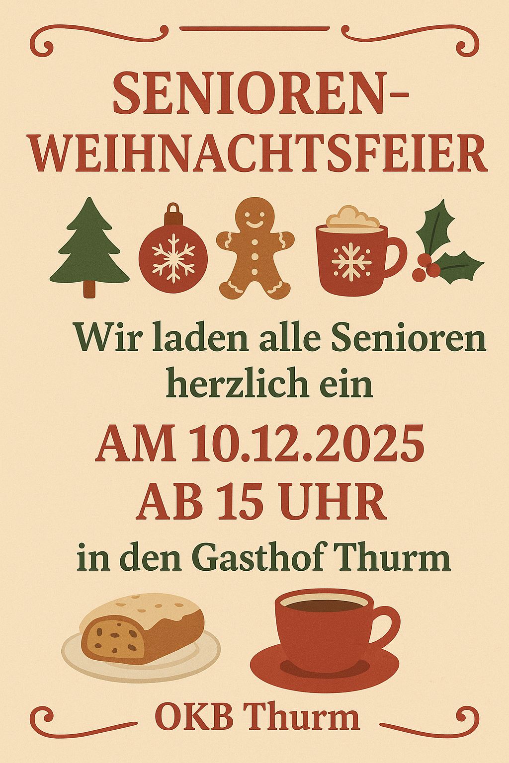 Der Ortskulturbeirat Mülsen OT Thurm lädt alle Seniorinnen und Senioren herzlich zur traditionellen Weihnachtsfeier in den Gasthof Thurm ein.