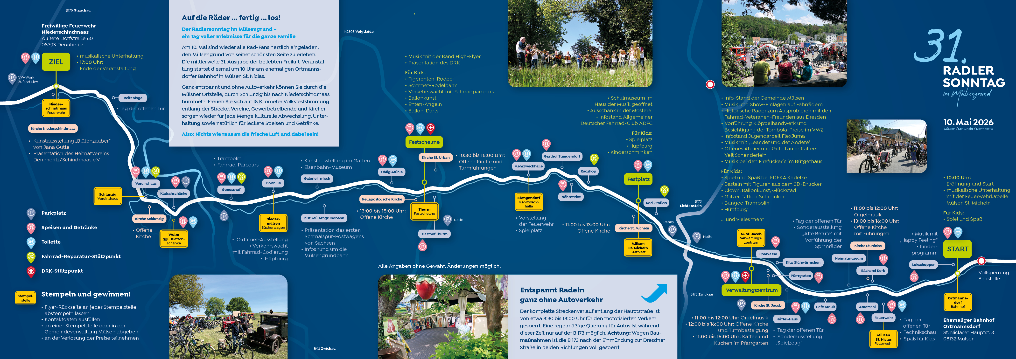 Ganz entspannt und ohne Autoverkehr können Sie am Radlersonntag durch die Mülsner Ortsteile bummeln. Weiter geht es dann durch Schlunzig zum Ziel in Niederschindmaas. Freuen Sie sich auf 18 Kilometer Volksfeststimmung entlang der Strecke. Vereine, Gewerbetreibende und Kirchen sorgen für jede Menge kulturelle Abwechslung, Unterhaltung sowie natürlich für leckere Speisen
