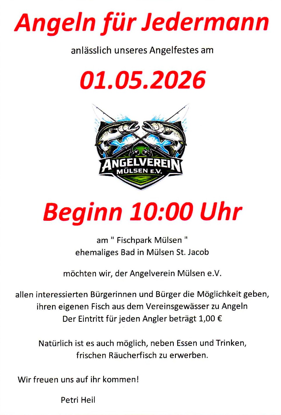 Allen interessierten Anglern ohne Fischereischein wird am 1. Mai die Möglichkeit geboten, ihren eigenen Fisch aus dem Vereinsgewässer zu angeln. Bei Ihrer Ankunft erhalten Sie alle notwendigen Informationen über den Ablauf. Zudem stehen erfahrene Mitglieder vor Ort mit Rat und Tat zur Seite.