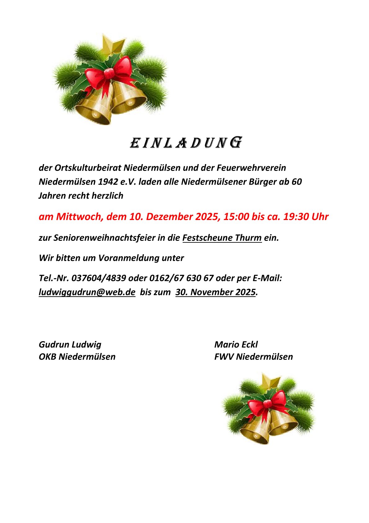 Der Ortskulturbeirat Niedermülsen und der Feuerwehrverein Niedermülsen 1942 e.V. laden alle Niedermülsener Bürger ab 60 Jahre recht herzlich ein.
